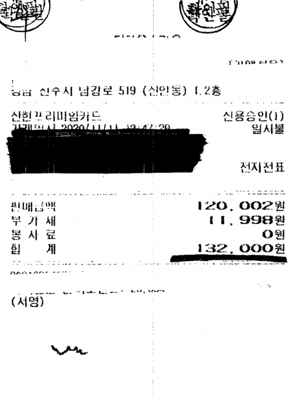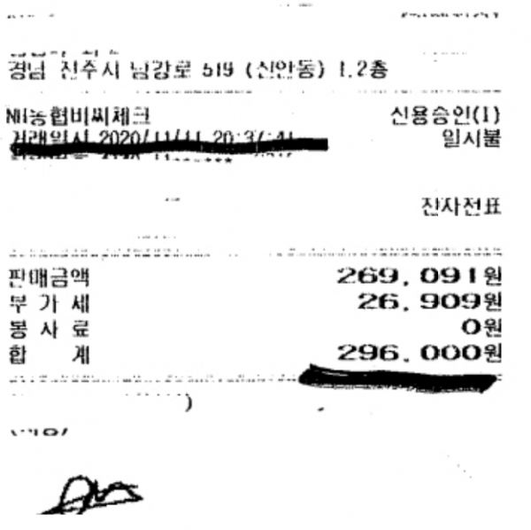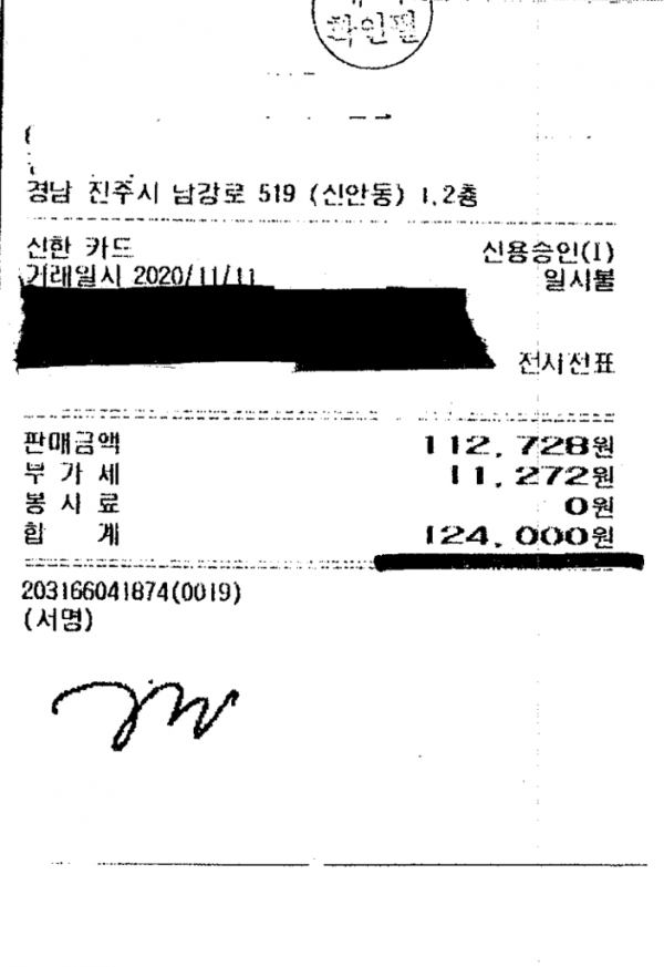 또 2020년에는 11월 2일 33만 원, 11월 5일 36만 원, 11월 16일 24만 원, 12월 16일 25만 원을 쓰기도 했다. 이 중에는 거래일과 매장 정보, 결제 시각까지 확인되는 명세도 있다. 11월 5일 자 ‘촉석루 한정식’(36만 원) 결제 영수증을 보면 오후 8시 21분에 결제가 이뤄졌다고 적혀있다.