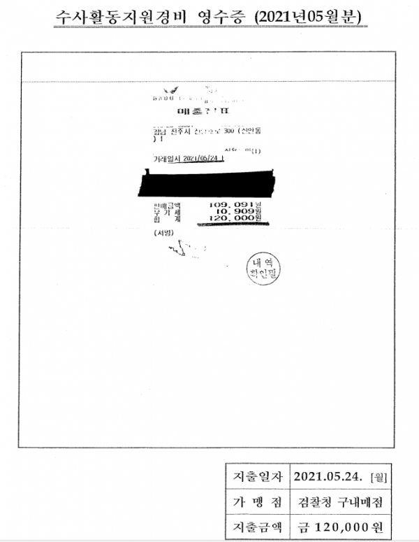기밀 수사와 연관성을 찾기 어려운 지출은 또 있다. 2021년 5월 24일에는 검찰청 구내매점에서 결제한 내용도 확인된다. 계산 금액은 12만 원. 구입 내용이 까맣게 가려져 있어 구체적인 내용까지는 드러나지 않는다.