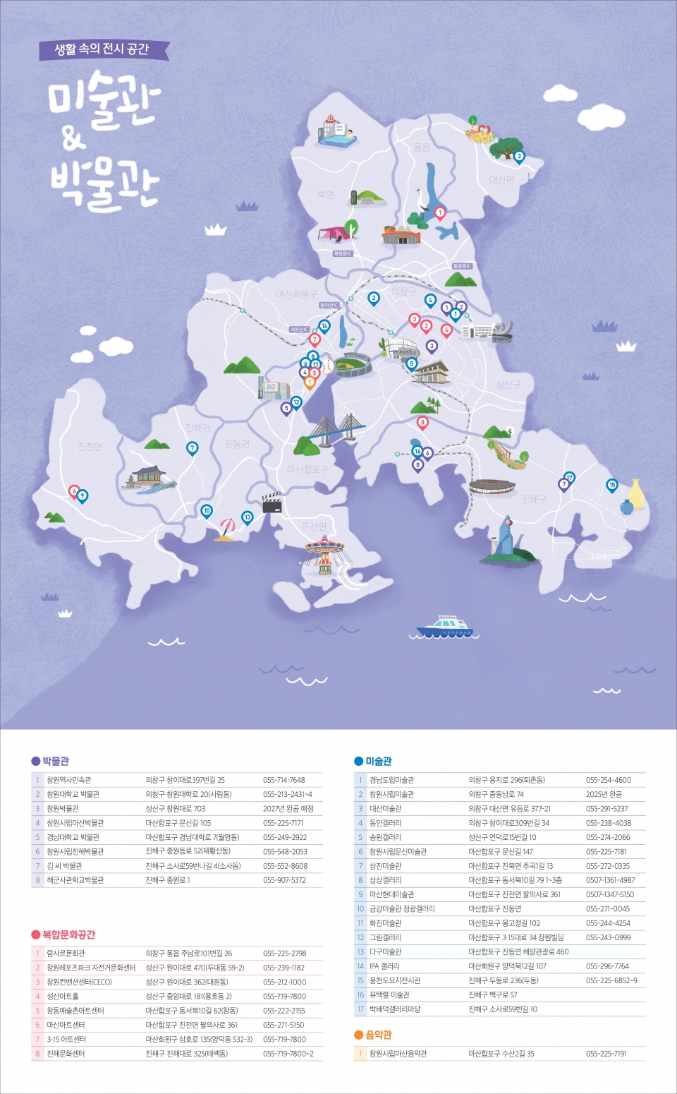 창원에는 공공과 민간을 모두 포함해 박물관이 8곳, 미술관이나 갤러리는 17곳이나 있다. 구체적으로 미술관과 갤러리는 경남을 대표하는 경남도립미술관을 비롯해 조각가 문신의 작업공간이던 창원시립문신미술관 등과 민간이나 개인이 운영하는 마산현대미술관, 대산미술관, 삼진미술관, 상상갤러리, 동인갤러리, IPA갤러리, 금강미술관 정광갤러리 등이 있다. 박물관은 창원시립마산미술관과 창원역사민속관, 창원시립진해박물관 등 공공 박물관, 창원대·경남대박물관을 비롯해 김 씨 박물관 같은 개인 박물관까지 다양하다.