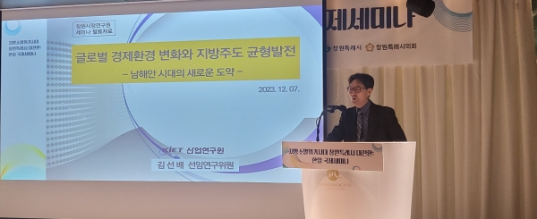 김선배 산업연구원 선임연구위원은 ‘글로벌 경제환경 변화와 지방주도 균형발전-남해안 시대의 새로운 도약’을 주제로 발표했다. 김 연구위원은 한국은 지역소멸과 기존 산업지역 쇠퇴가 동시에 일어나는 ‘이중’의 문제가 있다고 진단했다.
