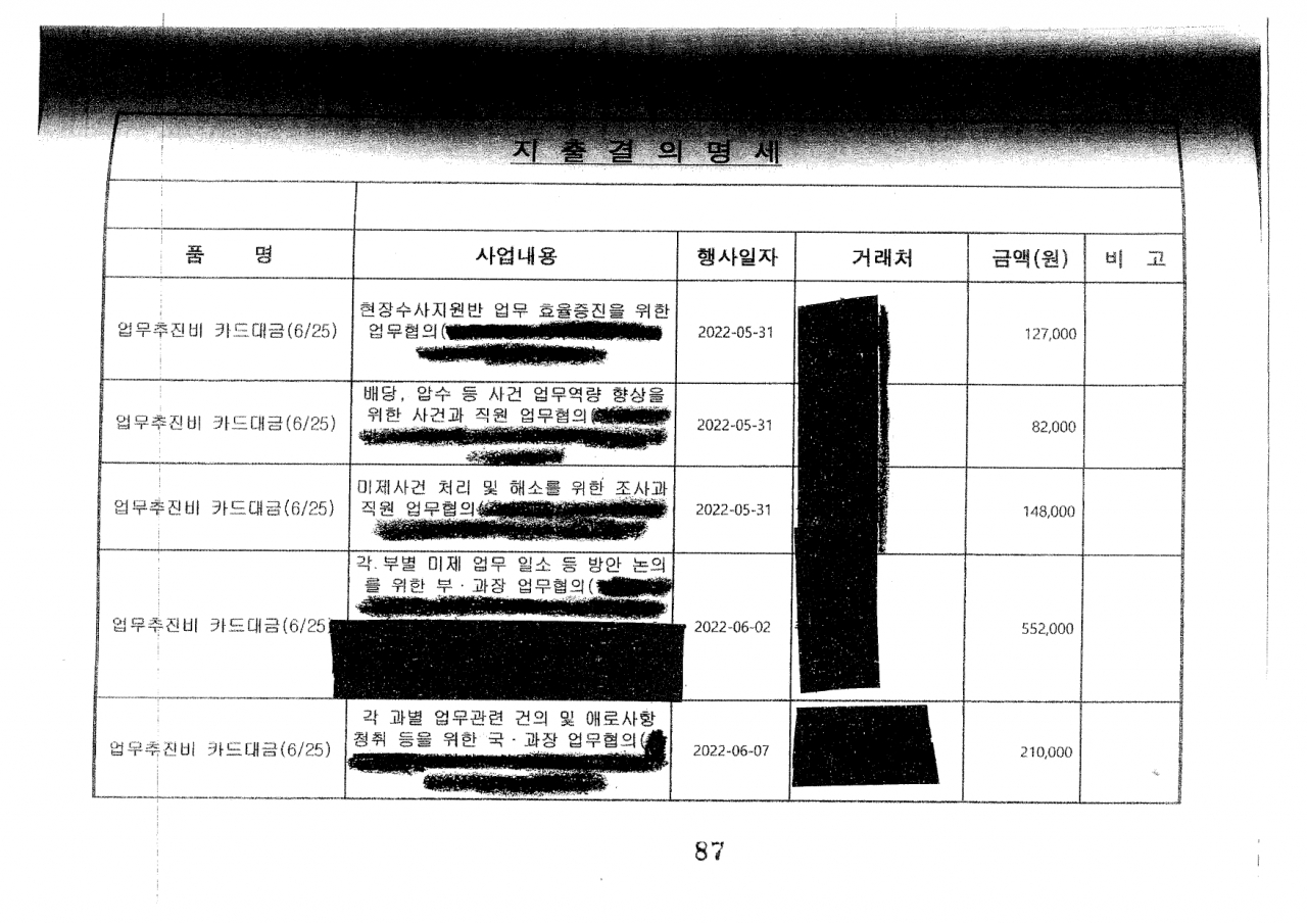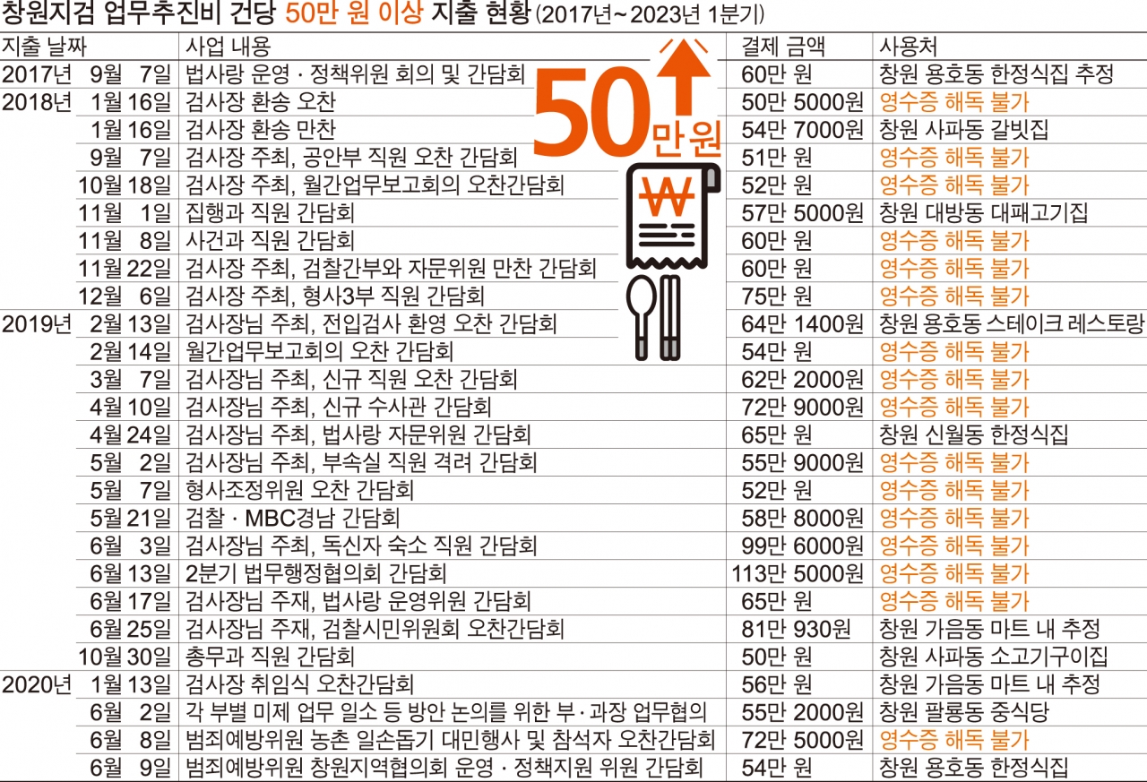 영수증이 있는 경우에는 △2019년 2월 13일 검사장님 주최, 전입검사 환영 오찬 간담회(64만 1400원·창원 용호동 스테이크 레스토랑) △2022년 6월 2일 각 부별 미제 업무 일소 등 방안 논의를 위한 부·과장 업무협의(55만 2000원·창원 팔룡동 중식당) 등이 눈에 띈다.