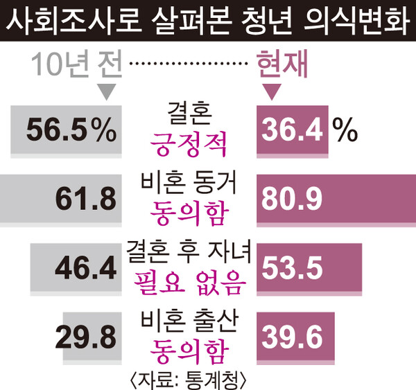 가족 인식에서 이미 다변화 현상이 두드러진다. 통계청에서 지난해 발표한 <사회조사로 살펴본 청년의 의식변화>에서 결혼을 긍정적으로 생각하는 청년 비중(2022년 기준)은 10년 전 56.5%보다 20.1%포인트(p) 감소한 36.4%로 나타났다. 청년들은 ‘자금 부족(33.7%)’과 ‘필요성을 못 느낌(17.3%)’을 결혼하지 않는 주된 이유로 꼽았다.