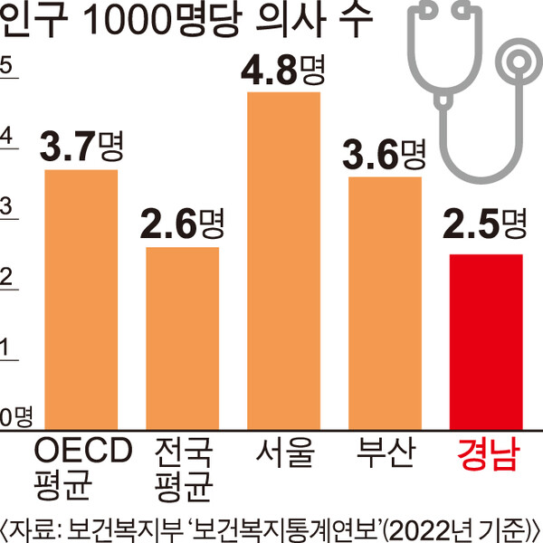 경남을 비롯한 전국의 비수도권 지역이 공공의료 부족에 시달리고 있다. 지난해 기준 경남 18개 시군에 부족한 공중보건의는 50여 명에 이른다. 경남 의사 수도 인구 1000명당 2.5명으로 서울(4.8명)의 절반이다.