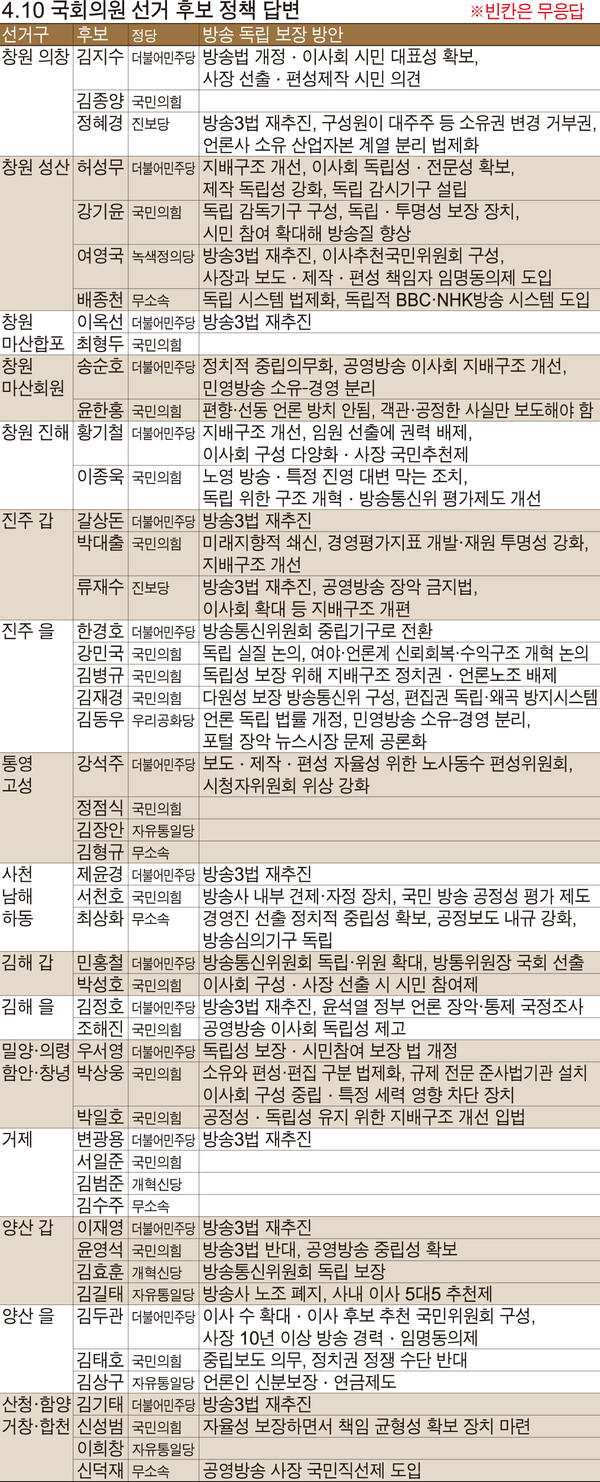 야당 후보들은 방송3법 재추진 의지를 밝혔다. 변광용 민주당 거제 후보는 “법 개정 재추진과 표현의 자유 보장, 공정한 언론 환경으로 알 보장권리에 앞장서겠다”고 했다. 여영국 녹색정의당 창원 성산 후보는 “거대 양당이 법적 근거도 없이 나눠 먹기로 추천권을 행사하는 공영방송 이사회 구성 관행을 바꿔야 한다”며 “정의당은 ‘이사추천국민위원회’를 구성해 공영방송 이사 추천 권한을 국민이 직접 행사하도록 요구해왔다”고 설명했다.
