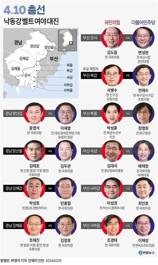 경부울 선거 핵심은 ‘낙동강 벨트’다. 경남 김해 갑·을, 양산 갑·을에 부산 사하 갑·을, 사상, 북구 갑·을, 여기에 강서가 분구해 총 10개 선거구가 있다. 4년 전 총선에서 9개 선거구였을 때는 민주당이 5석, 국민의힘이 4석을 차지했다. 이곳 결과는 이번에도 예측하기 어렵다. 중앙선거여론조사심의위원회에 등록된 4월 1~7일 공표 여론조사 결과 중 5%포인트(p) 내 접전 지역이 4곳(부산 북구 을·강서·사하 을, 경남 양산 을)이다.