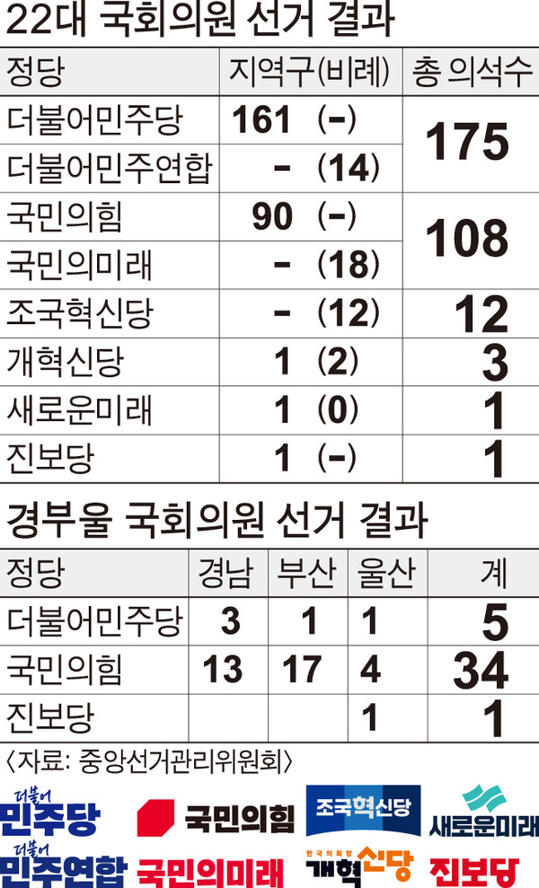◇여야 모두 ‘전국 정당화’ 한계 = 민주당은 호남 석권과 서울 한강 벨트 안착, 대전·세종·충청권 대승으로 더욱 사기를 올렸다. 그러나 ‘낙동강 벨트’가 무너지는 등 경남·부산·울산 전체 40석 중 5석을 차지하는 데 그쳤다. 21대 7석보다 2석 적다.