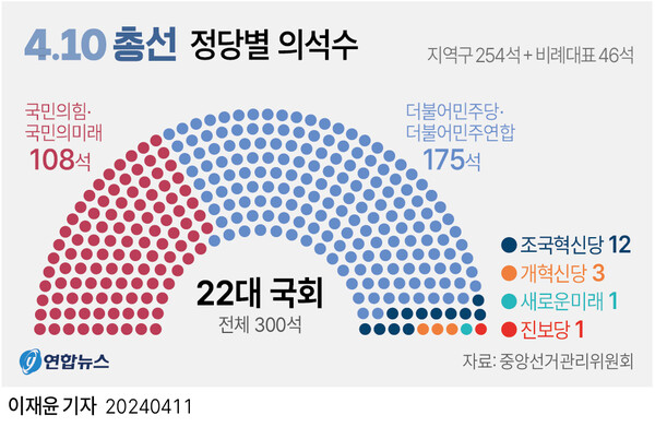 ◇양극화 정치…토론보다 공격만 남아 = 22대 국회의원 선거 당선자 300명 중 94%(283명)가 거대 양당인 더불어민주당과 국민의힘 소속이다. 나머지는 조국혁신당 12명, 개혁신당 3명, 새로운미래 1명, 진보당 1명에 그쳤다.