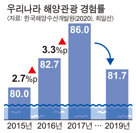 ◇경남 바다의 잠재력 = 새로운 관광 트렌드는 분명 경남 지역 어촌을 포함한 도내 해양 관광 산업 활성화에 큰 자극을 줄 수 있을 것으로 보인다. 우리나라 해양 관광 경험률은 2015년 80%를 넘어선 이후 2017년 86%로 정점을 찍는다. 2019년 코로나 영향으로 81.7%로 떨어지긴 했다. (한국해양수산개발원 <해양레저관광실태조사> 2020) 그래도 적어도 국민 10명 중 8명 이상은 해양 관광을 경험한 것으로 볼 수 있다. 해양 관광 경제 규모를 가늠할 수 있는 지표를 살펴 보면, 2020년 연안 지역 상권 매출액은 58조 원, 이 중 해양 관광 시장은 37조 4400억 원으로 추정한다. 특히 어촌 지역으로 추정되는 군 지역 해양 관광 시장 규모는 4조 5100억 원(나이스지니데이타)으로 집계된다. 하지만, 우리나라 해양 관광 분야 경제적 가치 비중은 0.4% 수준으로 미국(1.7%), 중국(7.9%), 프랑스(1.0%), 스페인(3.0%) 등에 비해 미미하다. 다시 말해 우리나라 해양 관광 분야는 아직 개발 여지가 많은 블루 오션이라고 할 수 있다. '지방 소멸' 시대에 소멸 위험이 큰 바닷가 어촌 지역이 역설적으로 엄청난 잠재력이다.