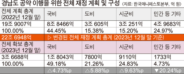 2022년 12월 말 애초 계획된 소요재정 19조 9007억 1300만 원 기준으로 국비 44.45%, 도비 15.38%, 시군비 15.20%, 민간 등 기타 24.97% 구성이었는데 민간·기타 비율만 확보율이 20.24%포인트(p) 낮았다.