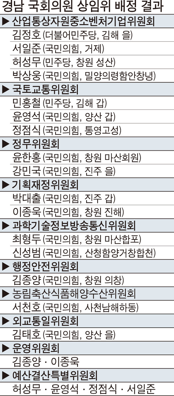 경남 지역구 의원들은 18개 위원회 중 11곳에 분산 배정됐다. 상임위별 소속은 △산업통상자원중소벤처기업위원회-김정호(더불어민주당, 김해 을)·서일준(국민의힘, 거제)·허성무(민주당, 창원 성산)·박상웅(국민의힘, 밀양의령함안창녕) △국토교통위원회-민홍철(민주당, 김해 갑)·윤영석(국민의힘, 양산 갑)·정점식(국민의힘, 통영고성) △정무위원회-윤한홍(국민의힘, 창원 마산회원)·강민국(국민의힘, 진주 을) △기획재정위원회-박대출(국민의힘, 진주 갑)·이종욱(국민의힘, 창원 진해) △과학기술정보방송통신위원회 최형두(국민의힘, 창원 마산합포)·신성범(국민의힘, 산청함양거창합천) △행정안전위원회-김종양(국민의힘, 창원 의창) △농림축산식품해양수산위원회-서천호(국민의힘, 사천남해하동) △외교통일위원회-김태호(국민의힘, 양산 을) 의원 등이다.
