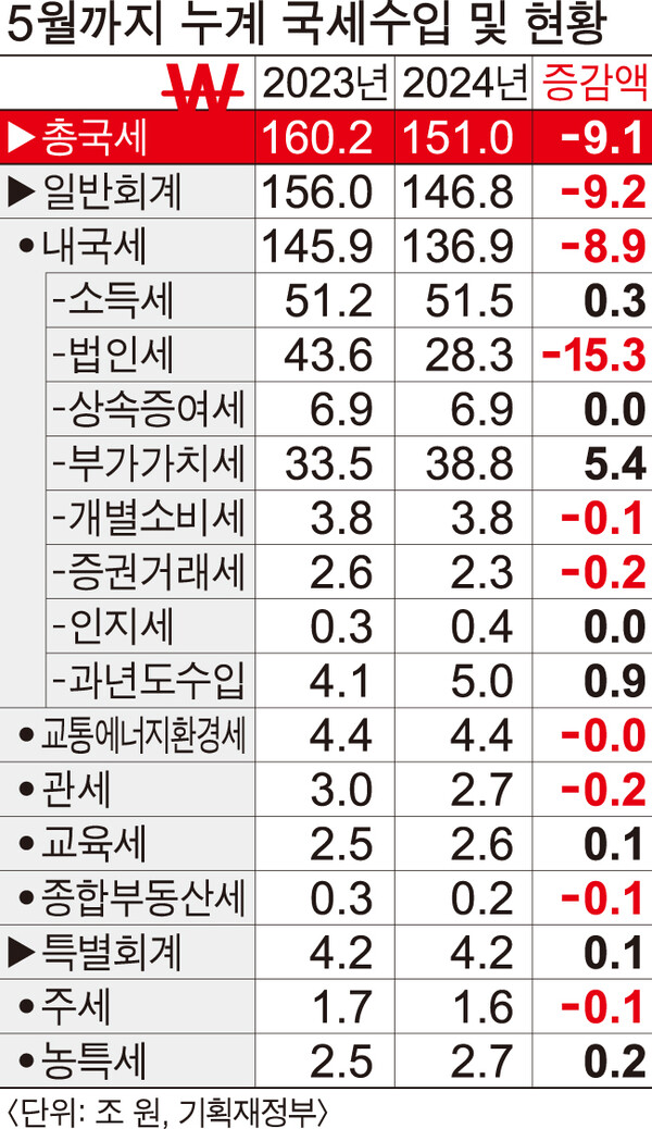 정부는 올해 세수를 367조 3000억 원으로 예상했다. 그런데 정부가 지난달 말 발표한 ‘2024년 5월 국세 수입 현황’에서 5월 말 누적 기준 세수는 151조 원으로 지난해 같은 기간(160조 2000억 원)보다 보다 9조 1000억 원 적게 걷혔다. 지방교부세 재원인 내국세도 8조 9000억 원 감소해 석 달 연속 세수 결손이 발생했다. 감소액이 가장 큰 세목은 법인세였다. 4월 12조 8000억 원 감소에 이어 5월에도 2조 5000억 원이 추가로 줄어 올해 총 15조 3000억 원이 누적 감소했다.