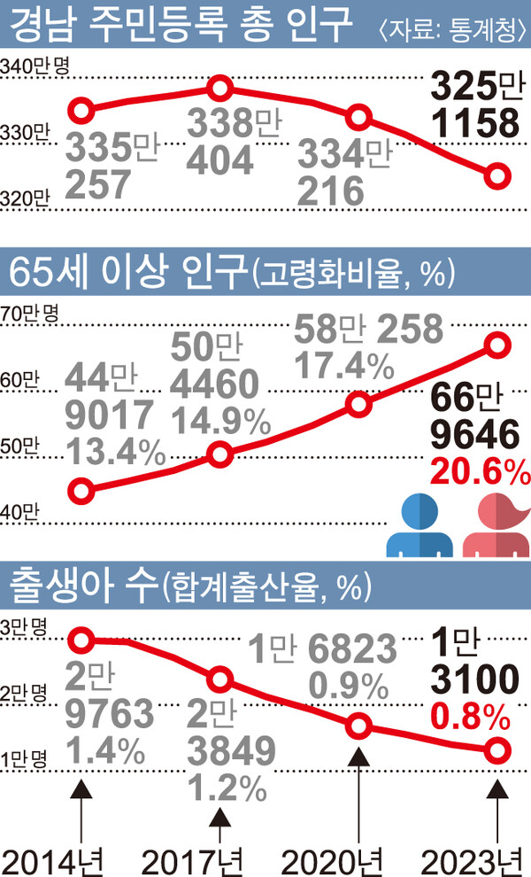 2023년 말 기준 경남 주민등록 총인구는 324만 1158명으로 경기·서울·부산에 이어 전국에서 네 번째로 많다. 경남 인구는 2017년 337만 명을 웃돌다 매년 감소 추세를 보이고 있다.