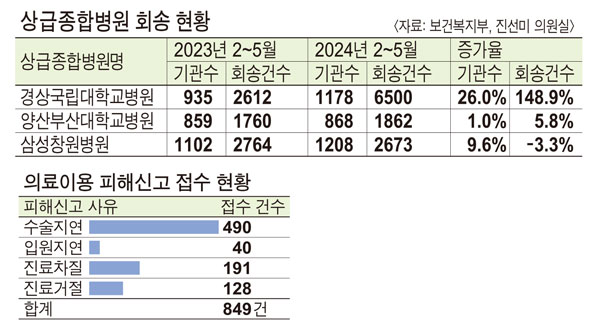 특히 경상국립대학교병원은 올해 2월부터 5월까지 6500건을 회송했다. 지난해 같은 기간 2612건과 비교하면 회송 건수가 148.9% 치솟았다. 양산부산대학교병원은 지난해보다 회송 건수가 5.8%(1760건→1862건) 늘었다. 반면 삼성창원병원은 2764건에서 2673건으로 3.3% 줄었다.