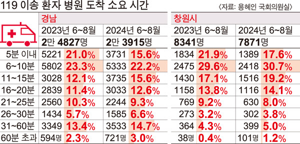 창원만 놓고 보면, 이송 시간이 1시간 이상 걸린 경우가 지난해 38명에서 올해 101명으로 166% 급증했다. 이 증가율은 대전(260%)과 대구(208%)에 이어 세 번째다. 반대로 이송 시간이 5분 이내였던 경우는 지난해 1834명에서 올해 1389명으로 24.2% 급감했다.