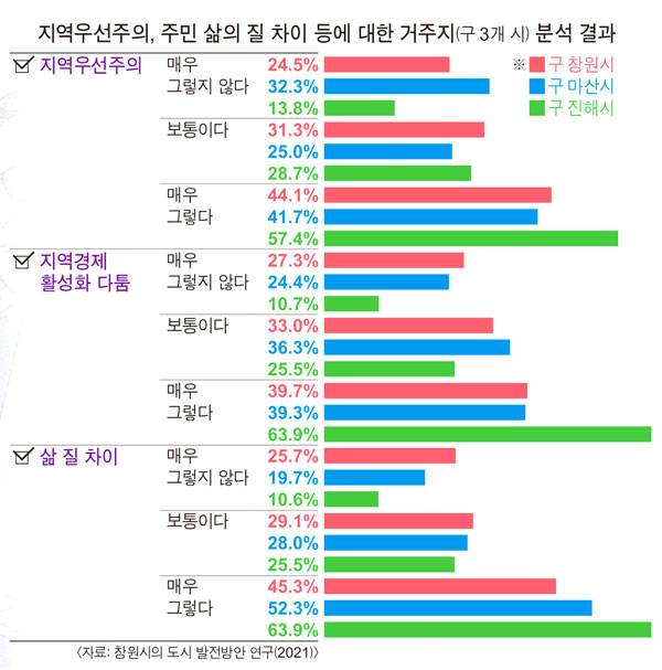 창원시의회·국립창원대는 2021년 9월 통합 10년 후 주민 인식을 조사한 <창원시의 도시 발전방안 연구>를 발표했었다. 창원시민 400명을 대상으로 창원시 지역 간 갈등, 창원시민 만족도 등을 대면 조사했다. 2013년 진행한 창원시민 인식 조사와도 비교했다.
