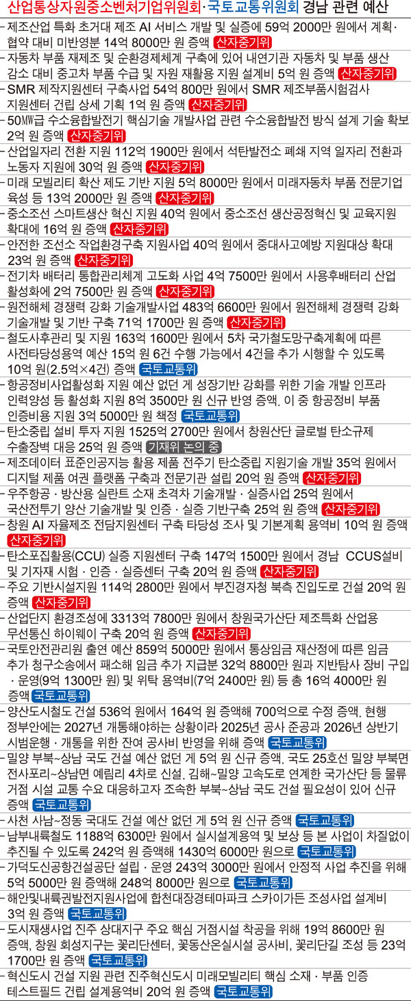 산자중기위 예비 심사를 통과한 경남 관련 예산으로는 △디지털 제품 여권 플랫폼 구축과 전문기관 설립 20억 원 △우주항공·바산 실란트 소재 초격차 기술개발·실증 사업 25억 원 △창원 인공지능(AI) 자율제조 전담지원센터 구축 타당성 조사·기본계획 용역비 10억 원 △경남 이산화탄소 포집·활용·저장(CCUS) 설비와 기자재 시험·인증·실증센터 구축 20억 원 △창원국가산단 제조특화 산업용 무선 통신 하이웨이 구축 20억 원 △부산진해경제자유구역청 북측 진입도로 건설 20억 원 등이 있다.