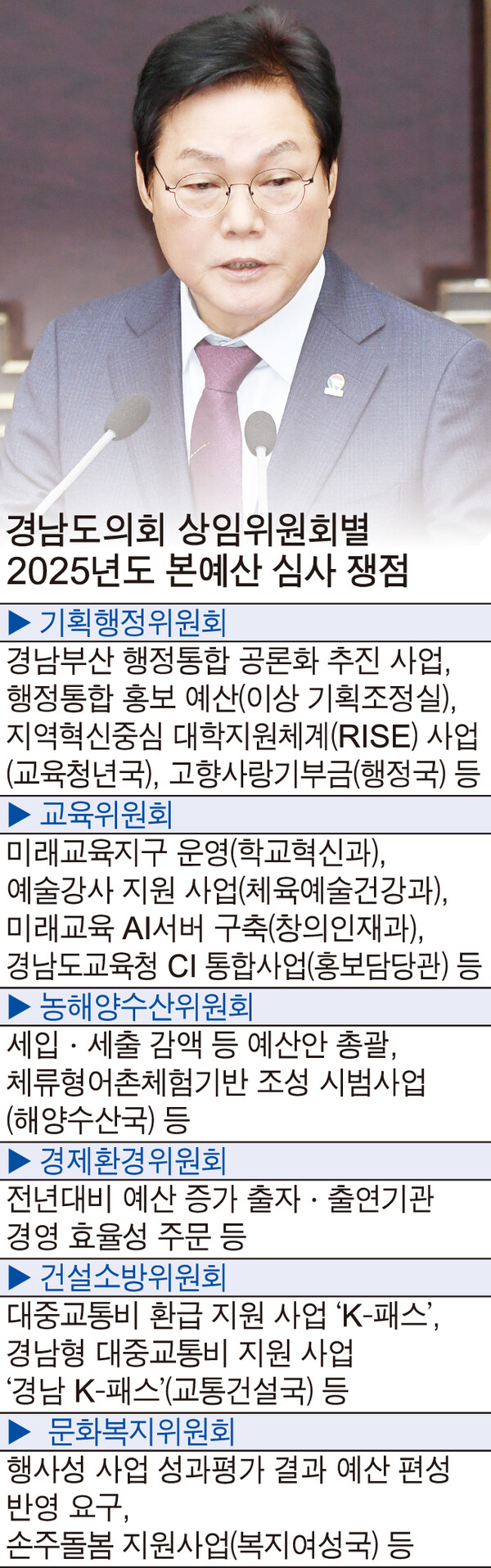 경남도의회는 우선 2~4일 상임위원회별로 2025년도 경남도 예산안을 예비심사하고 9~11일 예산결산특별위원회에서 종합심사한다. 최종 예산안은 13일 본회의에서 처리된다.
