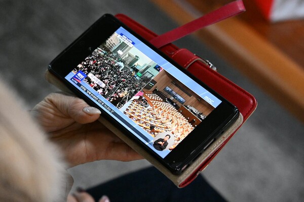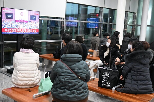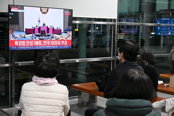 7일 창원중앙역에서 시민들이 국회의 윤석역 대통령 탄핵안 소추안과 김건희 특검법 표결 TV시청을 하고 있다. /김구연 기자