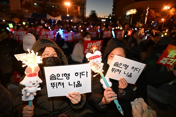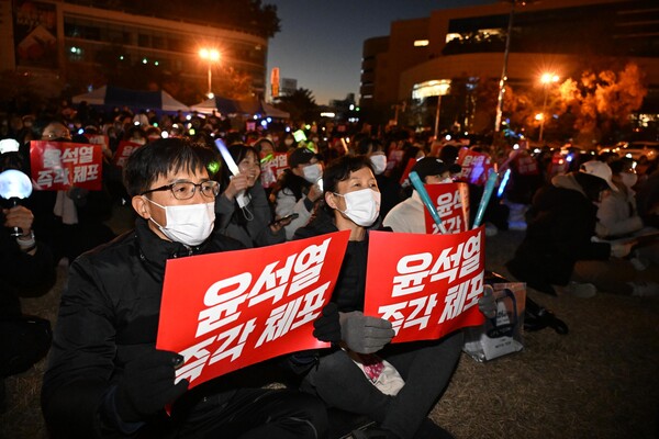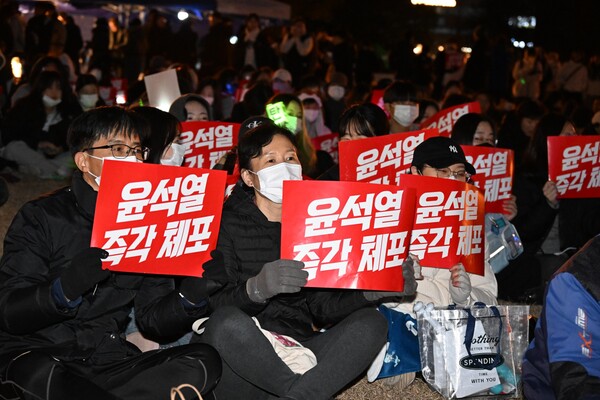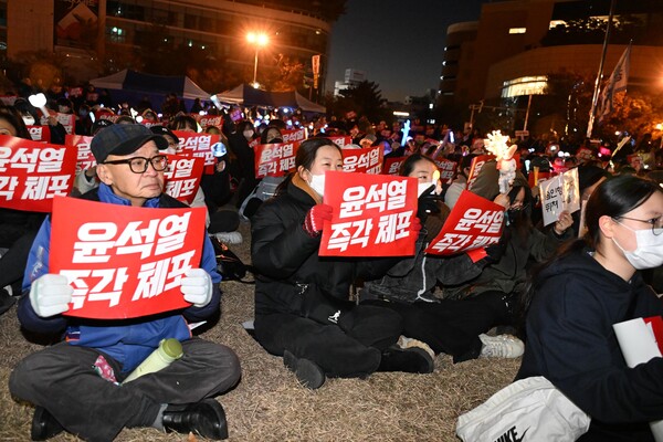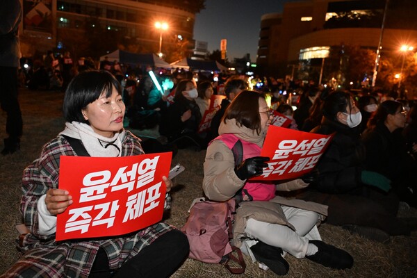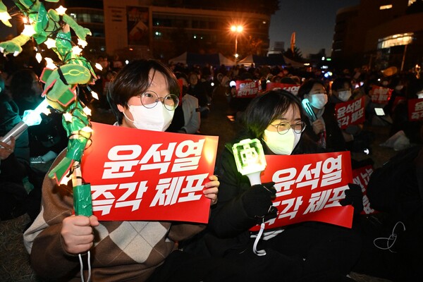 '내란수괴 윤석열 탄핵! 체포! 내란공법 국민의 힘 해체!'를 위한 창원시민대회가 2024년 12월 8일 오후 창원시청 앞 창원광장에서 열렸다. 시민들이 윤석열 퇴진 등의 구호를 외치고 있다. /김구연 기자