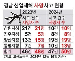 이달 16일 기준 올해 경남지역 사업장에서 사망한 노동자는 50명이다. 올해를 2주가량 남겨둔 시점에서 지난해 48명보다 2명 늘었다. 이는 잠정 집계된 수치로 산업재해 조사 결과에 따라 변동될 수 있다.