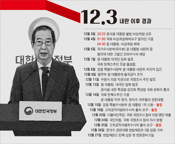 ◇시간은 내란 편? = 내란 종결이 급한 쪽 역시 핵심은 탄핵과 수사입니다. 민주당은 한 권한대행 담화 직후 탄핵안을 발의하면서 실력행사에 나섰습니다. 탄핵 절차가 제대로 진행된다면 다음 권한대행은 최상목 부총리입니다. 최 권한대행 체제에서도 첫 쟁점은 국회 추천 헌법재판관 3인 임명입니다. 문제는 권한대행 교체가 헌법재판관 임명을 보장하지 않는다는 것입니다. 후임 권한대행이 또 임명을 미룬다면 야당은 다시 탄핵을 고민할 수밖에 없습니다. 권한대행 선의에 맡기는 것 말고 별다른 대응 방법이 없습니다. 권한대행의 권한대행의 권한대행으로 이어지는 대응에서 국민의힘은 집요하게 틈을 찾을 듯합니다. 의사결정 과정에서 아까운 시간은 계속 흘러갑니다.