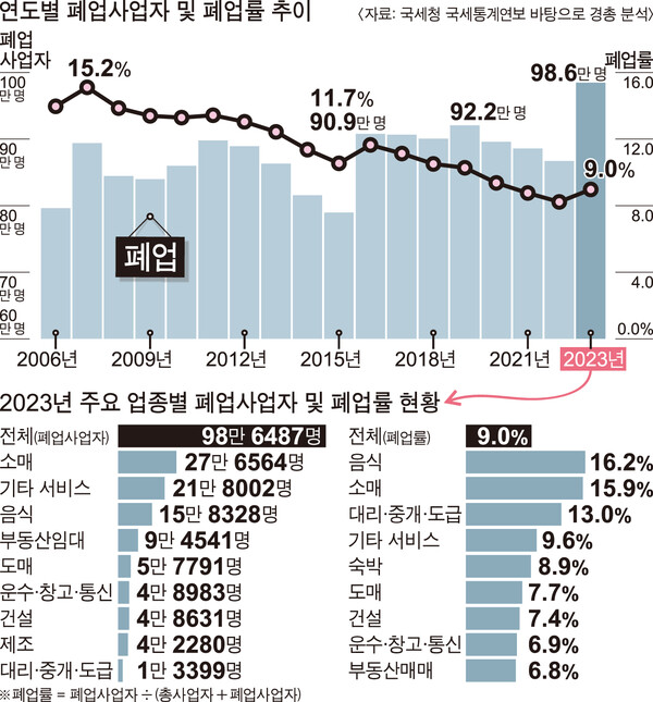 2023년 폐업사업자(법인, 개인사업자 포함)는 98만 6000명으로, 지난 2022년보다 13.7%(11만 9000명) 증가하면서 100만 명에 가깝다. 비교 가능한 통계가 집계된 2006년 이후 가장 많은 규모다.