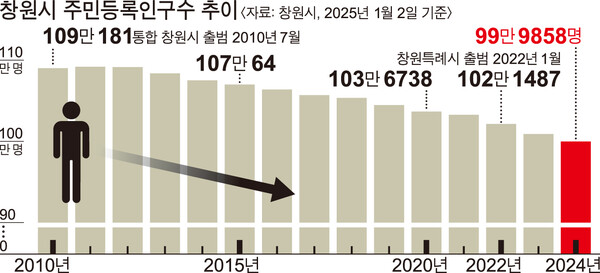 2010년 창원·마산·진해 3개 시가 통합 출범할 당시 인구 109만 명에서 2012년까지 109만 명대를 유지하던 인구는 점차 줄어들었다. 2015년 107만 명 선으로 내려가더니 2020년 103만 명으로 급격하게 감소했다. 통합 이후 해마다 평균 6000명 규모로 줄었고, 특히 2021(103만 2741명)~2022년(102만 1487명) 1만여 명이 창원시를 빠져나가면서 최대 폭으로 떨어졌다.