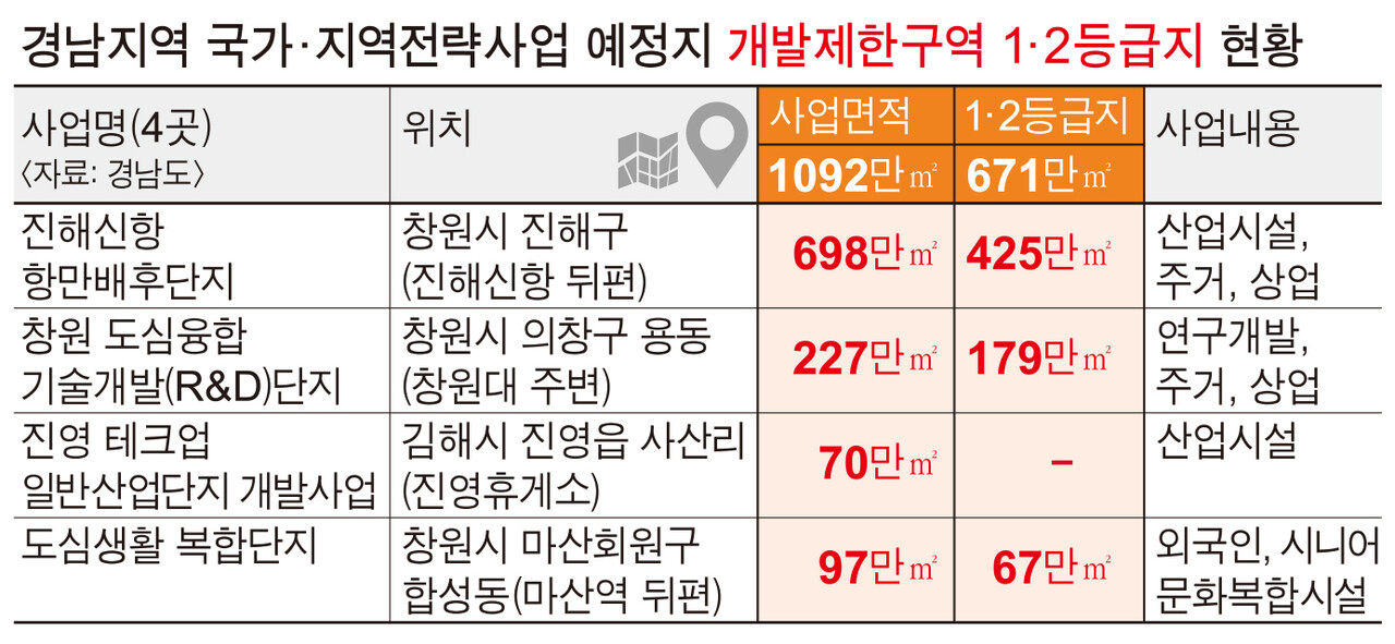 경남도 도시주택국 자료를 보면 국토교통부가 선정한 '개발제한구역 국가·지역전략사업' 예정지 4곳 1092만 ㎡ 가운데 671만 ㎡가 개발제한구역 환경평가 1·2등급지다. 전체 61.4% 비중이다.
