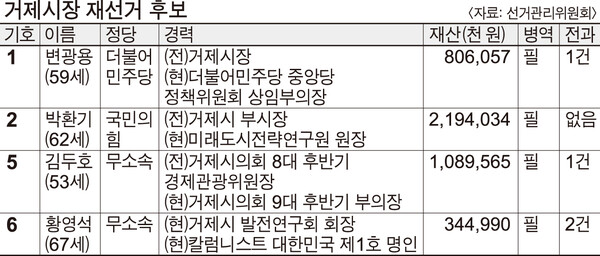 거제시장 재선거에 출마한 후보자 4명 가운데 3명에게 전과 기록이 있었다.
