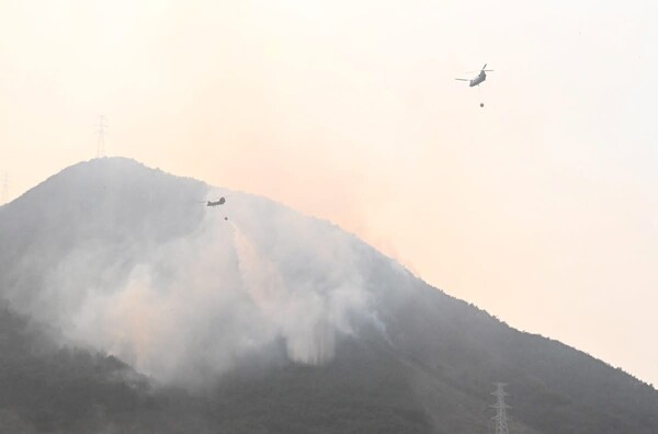 21일 산청군 시천면에서 시작된 산불이 산청군 단성면 자양리와 하동군 옥종면 두양리 경계지점까지 번졌다. 2025년 3월 23일 산청군 단성면 자양리 산에서 군헬기가 물을 뿌리고 있다. /김구연 기자