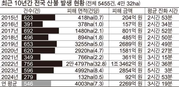 산불피해는 해마다 최소 279건, 최대 756건씩 발생했다. 구체적으로 △2015년 623건(418㏊) △2016년 391건(378㏊) △2017년 692건(1480㏊) △2018년 496건(894㏊) △2019년 653건(3255㏊) △2020년 620건(2920㏊) △2021년 349건(766㏊) △2022년 756건(2만 4797㏊) △2023년 596건(4992㏊) △2024년 279건(132㏊) 순이다.