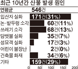 최근 10년 새 전국에서 발생한 산불은 연평균 546건이다. 매년 평균적으로 산림 4003㏊(축구장 5600개 면적)가 불에 탔다. 산불은 지금과 같은 봄철 많이 발생했다. 개인 부주의에 따른 실화가 가장 큰 화재 원인으로 지목된다.