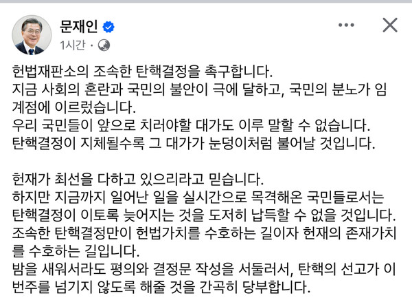 문 전 대통령은 "밤을 새워서라도 평의와 결정문 작성을 서둘러서 탄핵의 선고가 이번주를 넘기지 않도록 해줄 것을 간곡히 당부한다"고 말했다.