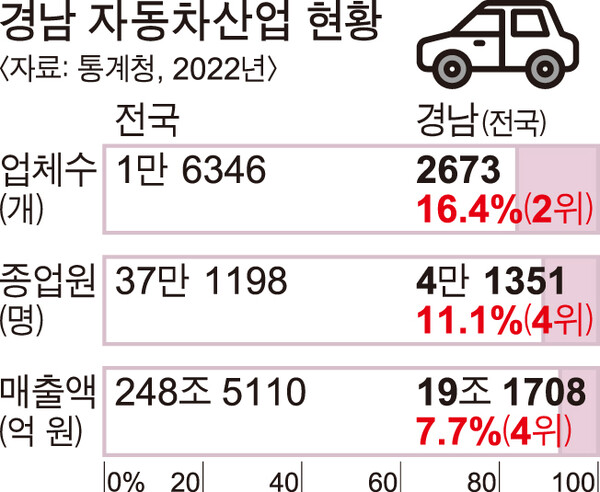 2022년 통계청 집계 기준 경남 도내 자동차산업 기업체 수는 2673개로 전국 1만 6346개의 16.2%를 차지한다. 경기도에 이어 전국 2위다. 종업원 수는 4만 1351명, 총매출액은 19조 1708억 원이다.