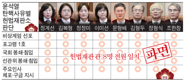 ◇세계 민주주의 역사 이정표 = 헌법학자들은 이번 결정이 세계 민주주의 역사에서 중요한 이정표가 될 것이라고 의미를 부여했다. 이장희 국립창원대 법학과 교수는 "12.3 비상계엄으로 훼손된 민주주의와 헌법 정의가 회복될 수 있었다는 데 의미가 있다"며 "우리만 그런 것이 아니라 전 세계적으로 미국도 트럼프가 민주주의를 퇴행시킨다는 지적이 많고, 유럽에서는 극우세력이 적잖이 나타나고 있고, 터키와 미얀마에서는 쿠데타로 군정도 일어나 민주주의 파괴로 많은 사람이 힘든 상황인데 이번 결정이 세계 시민들에게 민주주의 수호와 회복에 희망과 용기를 줄 수 있는 모범적 사례가 될 것이라고 본다"고 말했다.