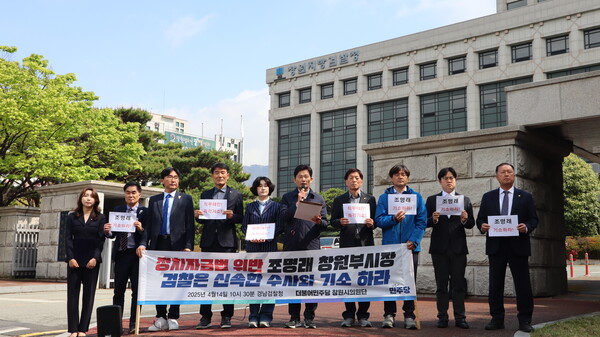 민주당 창원시의원단은 “검찰 스스로 법 엄정성과 형평성을 훼손하고 있다”며 “조 부시장을 즉각 공소 제기해야 한다”고 주장했다. 그러면서 “언론 보도로 조 부시장이 창원 제2국가산업단지 후보지 선정 과정에 ‘정치 브로커’ 명태균 씨에게 보고하는 등의 의혹이 제기됐다”며 별도 조사도 요구했다.