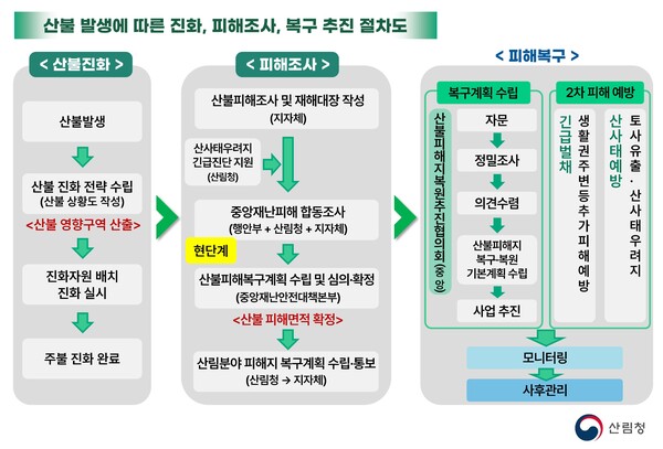이런 가운데 산림청은 지난 11일 산사태, 토사 유출 등으로 2차 피해가 우려되는 지역 4207개소를 긴급 진단했다. 조사 결과를 토대로 응급 복구와 산불 피해 나무 제거에 나설 예정이다. 또한 피해 정도에 따라 자연·생태·조림 복원과 같은 방법을 적용할 계획이다. 피해 주민, 산주, 전문가가 참여하는 중앙·지역 단위 산불피해지 복원추진 협의회도 구성·운영하며, 산불피해지 복구·복원 기본계획도 세운다.