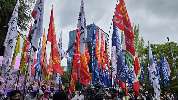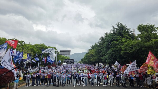 이날 대회 현장인 최윤덕 장상 옆 편도 3개 차로는 형형색색의 노동조합 대표 깃발과 조끼, 머리띠를 착용한 이들로 붐볐다. 비가 오는 궂은 날씨에도 노동자들은 우비를 입고 모자를 써 200여m에 달하는 행렬로 줄지어 앉아 자리를 지켰다. 서로 조직은 달랐지만 목소리는 하나였다. 모든 노동자에 인간다운 삶을 보장하라는 것이었다.