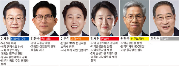◇이준석 개혁신당 후보 “지역 정책 결정권 확대” = 이준석 개혁신당 후보는 법인세 중 30%를 법인지방소득세로 전환하고, 세율을 지방자치단체가 자율 결정할 수 있도록 하는 공약을 내놨다. 이처럼 지역의 정책 결정권을 제도적으로 확대하는 쪽으로 자치분권·균형발전을 기초를 다진다는 복안이다. 현행 전국적으로 같게 적용되는 최저임금제를 광역자치단체가 ±30% 안의 범위에서 결정하도록 바꾸는 방안도 제시했다. 이는 기업들의 이전 입지 선택권 확대와 지역 간 정책 경쟁을 유도하는 데 목적이 있다. 국내 복귀 기업에는 감세와 규제 유예 등 유인을 제공하겠다고 밝혔다. 하지만 메가시티 구상, 2차 공공기관 이전, 에너지망 확대, 교통 인프라 확충 등 ‘그랜드 비전’은 없는 건 아쉬운 지점이다. 이 후보는 다만 “효율, 분권, 책임을 원칙으로 지방에 실질적인 결정권을 주겠다”고 밝혔다.