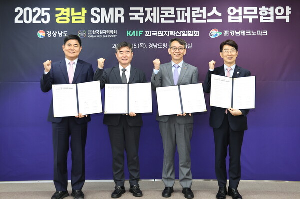 경남도는 15일 한국원자력학회, 한국원자력산업협회, 경남테크노파크와 '2025 경남 소형모듈원자로(SMR) 국제콘퍼런스' 성공적 개최를 위한 업무협약을 맺었다. 연구기관·대학·기업 등 SMR 분야 전문가로 구성된 기술기획위원회가 올 10월 행사 세부 프로그램을 마련한다. /이동욱 기자 ldo32@idomin.com