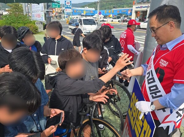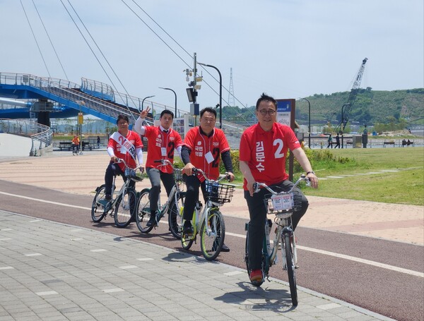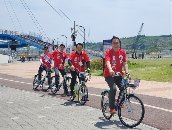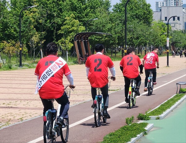 최형두(국민의힘·창원 마산합포) 국회의원과 창원시 마산합포구 당협위원회 구성원들이 18일 공공자전거 누비자를 타고 지역구 내 창원 마산 3·15해양누리공원을 달리며 국민의힘 김문수 대선 후보 선거 운동을 펼치고 있다.