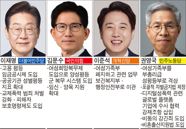 ◇김문수 ‘돌봄 강화’, 이준석 ‘여가부 폐지’ = 김문수 국민의힘 후보와 이준석 개혁신당 후보도 10대 공약에 여성·성평등 공약을 포함하지 않았다. 역시 일부 핵심 분야에 여성·성평등 의제가 한두가지 포함된 정도다. 게다가 자녀가 있는 가정 위주의 공약, 저출생 해법만 제시해 전반적인 성평등을 아우르기에는 부족하다는 지적이 나온다.