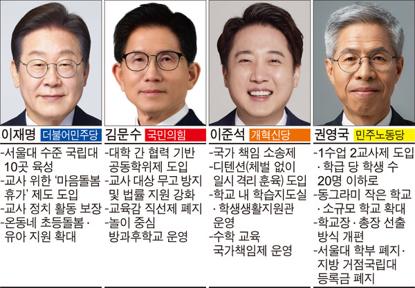 이재명 더불어민주당 후보와 김문수 국민의힘 후보는 서울과 지방 대학 간 격차 해소 필요성에는 공감하며 이를 공약에 포함했다. 그러나 교육의 정치적 중립을 둘러싸고는 뚜렷한 입장 차이를 보였다. 한쪽은 교사의 정치 활동 보장을 주장한 반면, 다른 쪽은 교육감 직선제 폐지를 언급했다. ‘서이초 사건’을 계기로 교권 침해와 학교 내 안전 문제가 사회적 이슈로 부각되면서, 후보들은 교사들이 교육에 전념할 수 있는 환경 조성 필요성에 한목소리를 냈다.