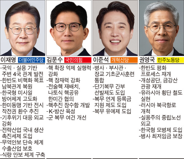 김문수 후보 공약 대부분은 북핵 억제에 쏠려 있다. 한국형 미사일 체계 강화, 북 도발에 대한 응징 체계 강화, 핵 잠재력 강화 등을 언급했다. 더 나아가 핵추진 잠수함 개발 추진도 공약에 넣었다. 사이버전 전담 전력 확충, AI 기반 유·무인 복합전투체계 도입도 언급했다.