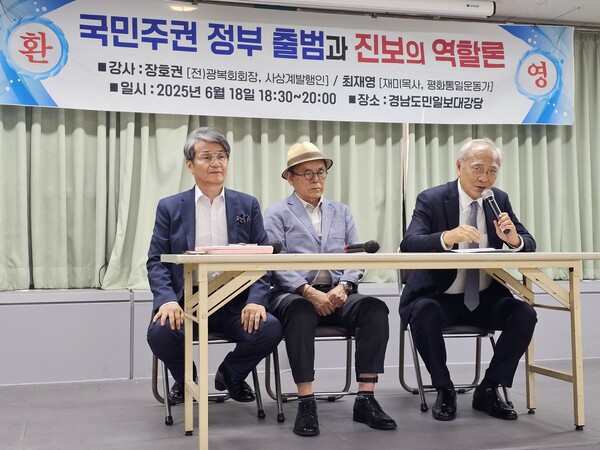최 목사는 지난 18일 오후 6시 30분 창원 마산회원구 양덕동 경남도민일보 본사 3층 강당에서 강연했다. 사단법인 민족일보기념사업회, 언론소비자주권연대, 한겨레신문 주주 독자 모임 초청에 따른 것이다. 그는 이날 창원을 찾아 '국민주권정부 출범과 진보의 역할론'을 주제로 발언했다. 송순호 더불어민주당 경남도당위원장, 박진해 전 MBC경남 대표이사, 임재택 부산대 교수 등 시민사회·정치·학계 인사 등 20여 명이 자리에 함께했다.