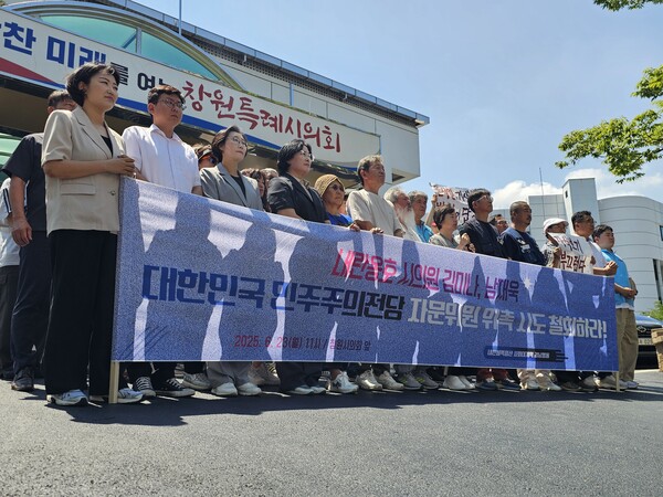 참석자 20여 명은 이태원 참사 유족을 모욕한 혐의로 유죄 판결받고 민주주의전당 건립 과정에서 망언을 한 김미나 시의원, 그리고 윤석열 탄핵 반대 집회에 꾸준히 참석해 윤 전 대통령을 옹호하는 발언을 서슴지 않은 남재욱 시의원 자문위원 임명을 취소해야 한다고 외쳤다. 두 사람은 같은 국민의힘 소속 손태화(양덕1·2, 합성2, 구암1·2, 봉암동) 창원시의회 의장 추천으로 민주주의전당 당연직 자문위에 포함됐다.