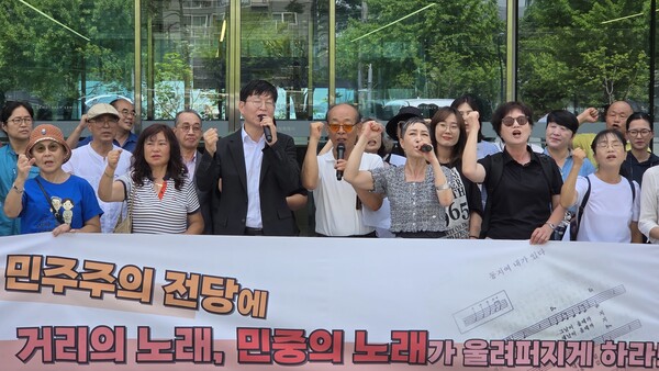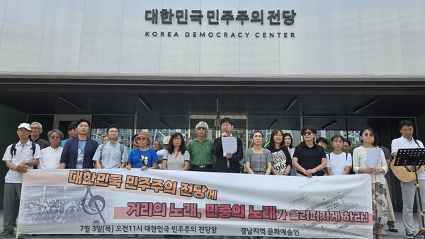 가수 김희정 씨는 “백마디 연설보다 노래 한 곡이 지닌 위력을 우리는 3.15의거부터 2025년 빛의 혁명 광장에서 확인했다”며 “이처럼 대한민국 민주주의 발전에 기여한 민중의 노래가 전당에 흘러나오거나, 기록의 흔적조차 없다”고 비판했다.