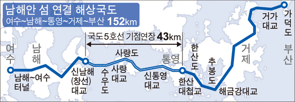 경남도가 추진 중인 '남해안 섬 연결 해상국도'는 전남 여수~경남 남해~통영~거제~부산을 잇는 전체 152㎞ 도로다. 여수를 기점으로 국도 77호선 남해~여수 해저터널을 지나 남해 창선면까지 연결하고, 이번 국도 5호선 연장으로 통영 수우도~사량도~도남동 구간이 새롭게 연결될 예정이다. 아울러 통영 한산도~추봉도~거제 동부면을 거쳐 거가대로로 부산시 송정동까지 이어진다.