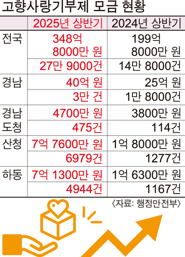 올해 상반기에 모인 고향사랑기부금이 지난해 같은 기간보다 74.5% 늘었다. 시행 3년 차를 맞는 고향사랑기부제 모금 규모는 날로 커지고 있다. 6월 30일 기준 경남도와 도내 18개 시·군에 보내진 고향사랑기부금도 지난해 상반기보다 60% 증가했다.
