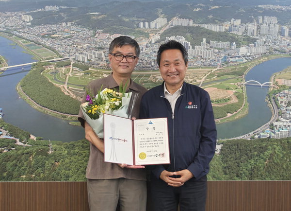 창원시 푸른도시사업소 공원녹지과 정익송(사진 왼쪽) 녹지조성팀장이 22일 울산시 전국 규제개혁 아이디어 공모전에서 우수상을 수상해 울산광역시장상과 시상금 50만 원을 받았다.
